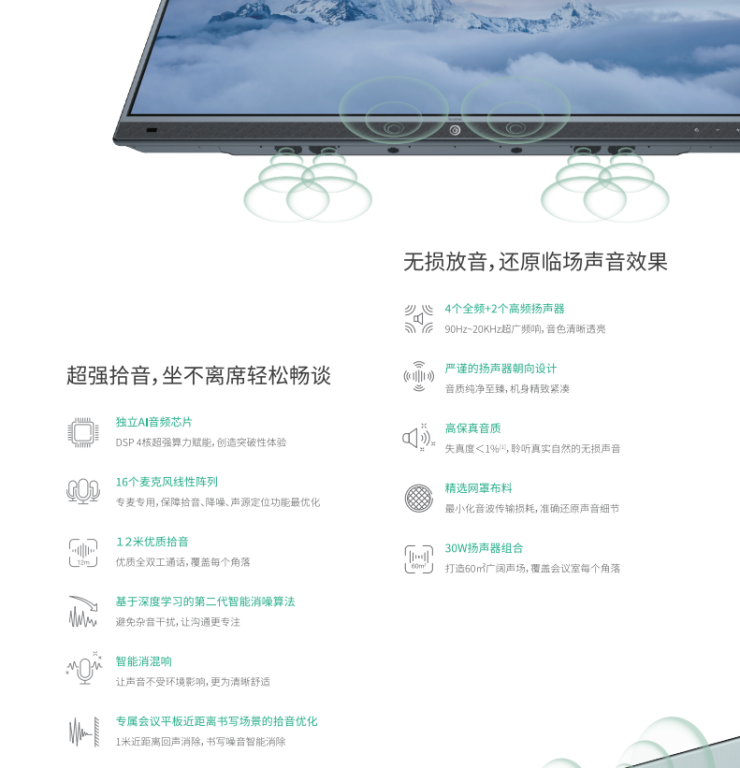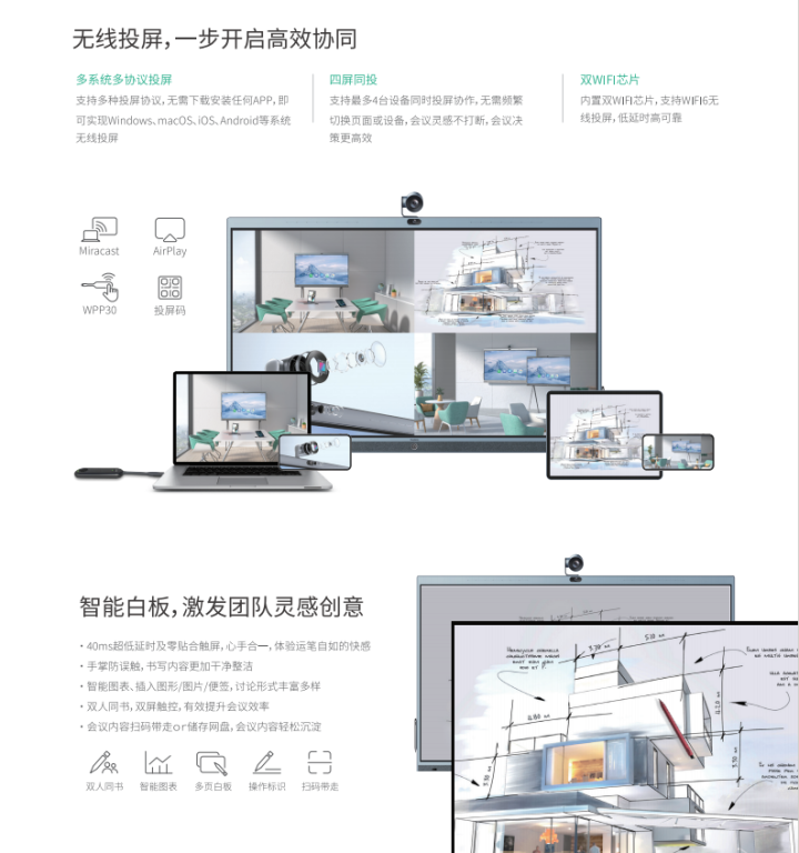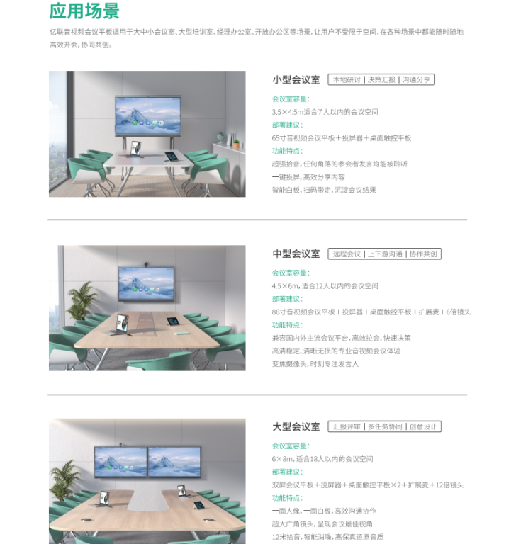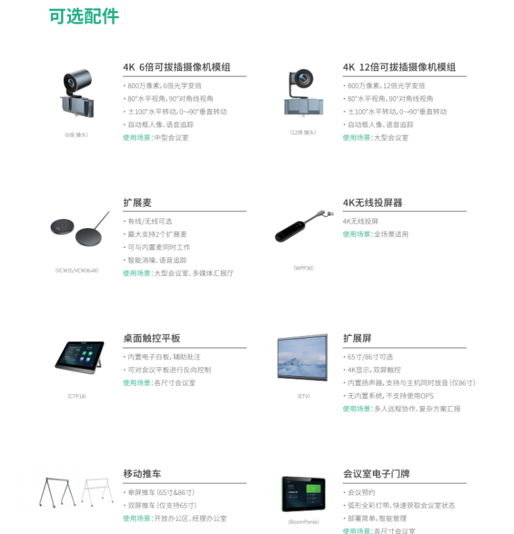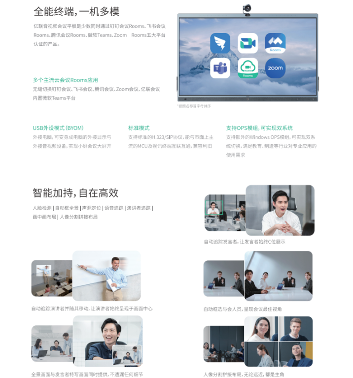 亿联网络新形态会议终端音视频会议平板,集专业音视频会议、高效协作白板、多方无线投屏等多功能于一身,兼容全视频会议生态, 搭载专业Al音视频能力,为企业带来高效智能的沉浸式视频会议体验,满足演示分享、书写协作、远程共创等需求,可以完美融入企业 各尺寸会议室、经理办公室、开放办公区等多种场景。 尺寸:65寸、86寸 颜色:灰黑色、云白色 安装方式:挂墙、推车 真正的4K会议:4K视频画面、4K投屏画面、4K屏幕显示 强大的硬件编解码能力:可同时提供最高4K50帧编码+4K80帧解码 自主的画面显示:支持4KSVC多流,可自由选看远端画面并调整画面布局 专业镜头,铸就高端视讯体验 SONY图像传感器:超大图像传感器、低噪点、高品质成像画质,还原自然色彩 双摄方案:选配可插拔光学变倍摄像机模组,组成智能双摄系统,适配中大型会议室场景 内置摄像机(标配) ·4K专业级镜头 ·追踪功能 ·自动开合物理隐私盖 可插拔光学变倍摄像机模组(选配) ·4K专业级镜头 ·光学变倍,满足远距离追踪4K无损画质特写提供6倍、12倍两种倍数,按需选配 |