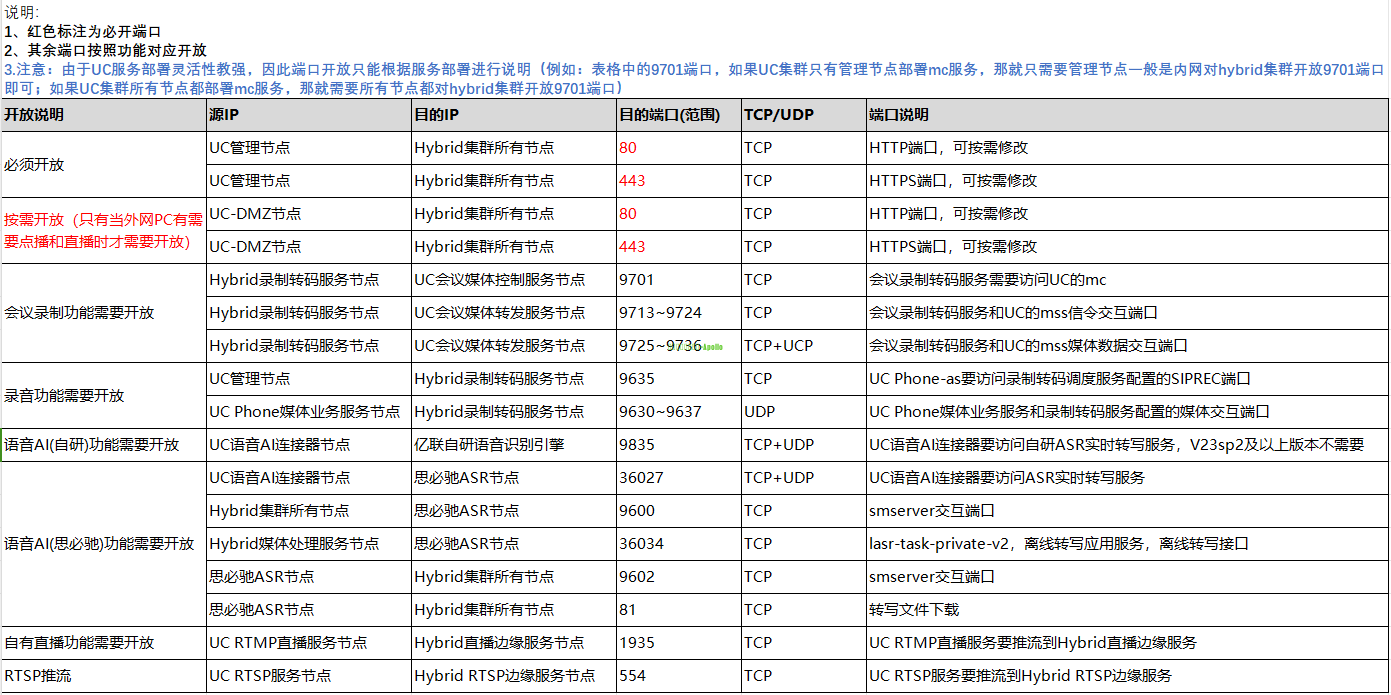 4.端口开放要求注:UC有边缘节点(DMZ)场景,还需要开放DMZ节点到Hybrid的https监听端口