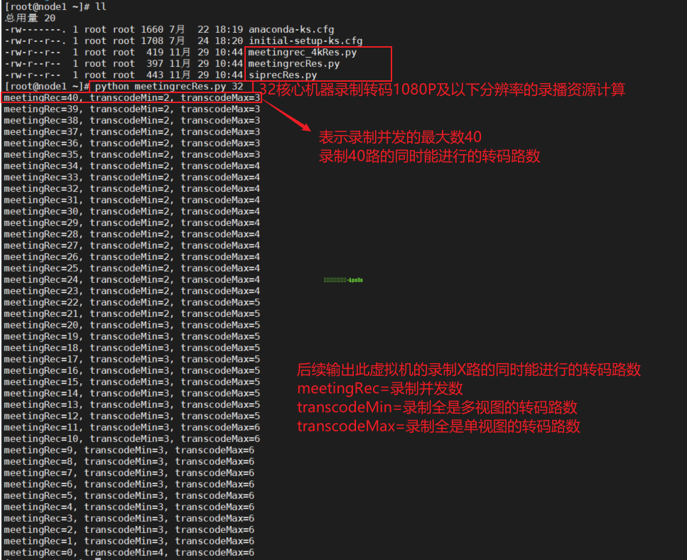 (1) 脚本说明:仅用于虚拟机计算,实体机需要看《2、实体机性能说明》 ① 4K 会议录制转码资源计算脚本:meetingrec_4kRes.py ② 1080P 及以下会议录制转码资源计算脚本:meetingrecRes.py ③ 录音转码资源计算脚本:siprecRes.p (2) 使用方式 ① 将上述脚本上传到任意服务器上 ② 执行 python xxx.py CPU核心数 通过lscpu查看CPU核心数;计算公式:CPU核心数=物理处理器数*每个物理处理器的核心数