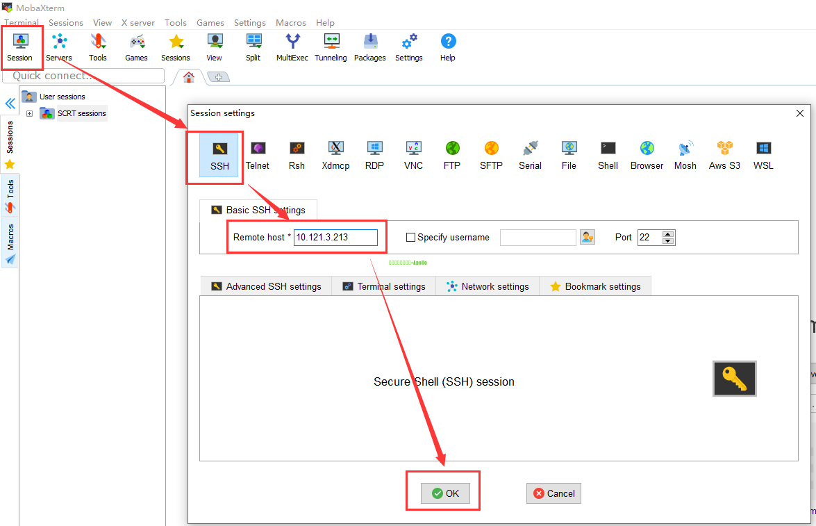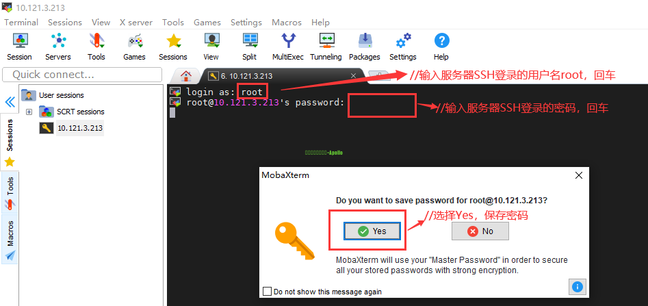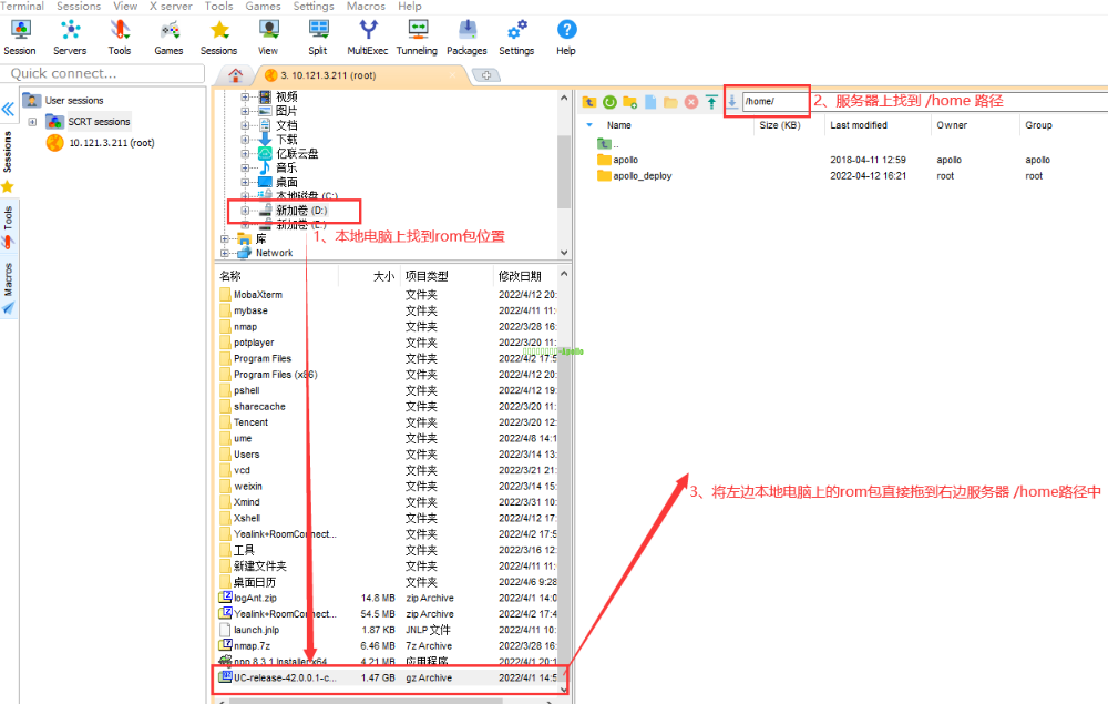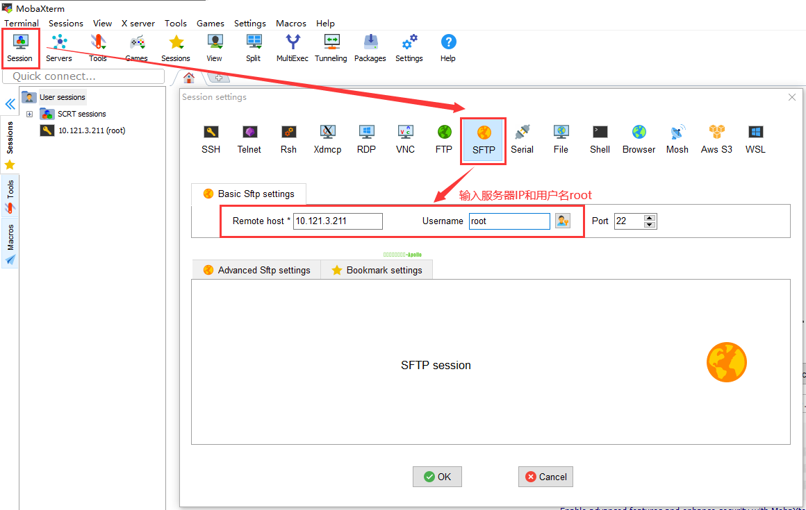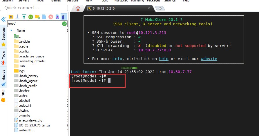 | (1)打开MobaXterm,选择Session-SSH-填写Remote host服务器IP地址-OK (2)在跳出的连接框中输入服务器SSH登录方式的用户名与密码 login as:root //输入用户名root root@10.121.3.213's password:Yealink@2022 //密码需要输入服务器的实际密码,比如这台服务器的密码为Yealink@2022 Yms@XXXXXX SN-后6 Do you want to save password for root@10.121.3.213? //选择是否保存密码,确认保存就选择Yes 3)登录成功,出现[root@xxx~]# ( 如下图所示出现[root@node1 ~]# ) MobaXterm中的SFTP上传1、选择SFTP,输入服务器IP和用户名root 2、上传rom包到 /home |