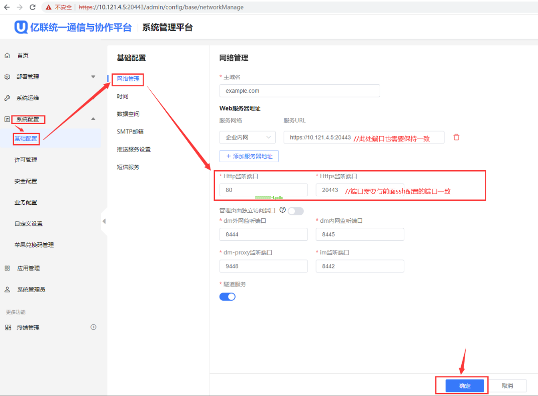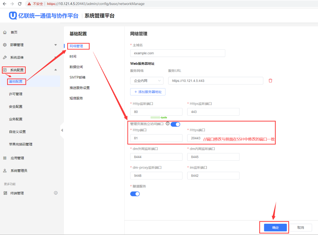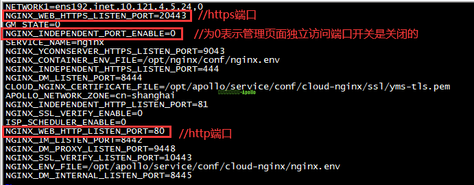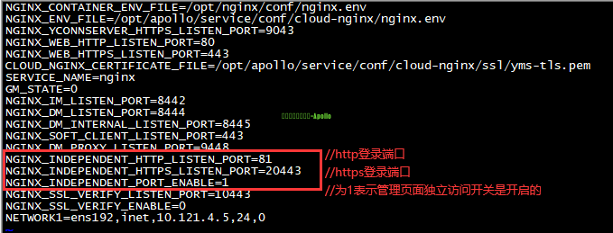 | 1、登录UC的SSH界面,假设服务器地址为10.121.4.5 2、关闭smserver服务 systemctl stop apollo-smserver.service //关闭smserver服务 3、查看nginx配置文件 vi /opt/apollo/service/conf/cloud-nginx/nginx.env //进入nginx.env文件进行编辑 首先确认管理页面独立访问端口开关NGINX_INDEPENDENT_PORT_ENABLE字段是0(关闭)还是1(开启) 分为两种情况: 情况一:NGINX_INDEPENDENT_PORT_ENABLE=0 (1)此时web页面登录端口以NGINX_WEB_HTTPS_LISTEN_PORT(https登录端口)、NGINX_WEB_HTTP_LISTEN_PORT(http登录端口)字段中的端口为准;此时可用查看到的端口进行web登录后从web修改端口(参考方法一);也可以按 i 进行端口修改,例如下图http改为80、https改为20443; 修改完成后,操作如下保存并退出: Esc //按下键盘的" Esc "按键,退出编辑模式 :wq //同时按下键盘上的 " Shift " 与 " ;" 按键,出现冒号后,再输入wq,点回车,保存并退出编辑 注:此处只是临时解决网页无法登录的问题;实际还需要网页上配置以将该监听端口的修改同步到数据库,保证其他服务都被通知到监听端口的修改事件 (2)如果选择在该文件中修改端口,需要重启下cloud-nginx容器 docker restart cloud-nginx //重启nginx容器 (3)登录UC的系统管理平台,修改网页上的监听端口,确保监听端口的修改同步到数据库 例如该举例场景可使用http://10.121.4.5/admin 或 https://10.121.4.5:20443/admin 临时登录设备系统管理界面 注:由于前面关闭了smserver,如果进入临时登录界面,输入账号密码登录后,界面加载提示业务超时、节点情况异常等,属于正常现象,接着往下操作即可 操作路径:系统配置-基础配置-网络管理-Http监听端口、Https监听端口修改端口为所需要的端口-确定 4)启动smserver服务 systemctl start apollo-smserver.service //启动smserver服务 情况二:NGINX_INDEPENDENT_PORT_ENABLE=1 (1)此时web页面登录端口以NGINX_INDEPENDENT_HTTP_LISTEN_PORT(http登录端口)、NGINX_INDEPENDENT_HTTPS_LISTEN_PORT(https登录端口)字段中的端口为准;此时可用查看到的端口进行web登录后从web修改端口(参考方法一);也可按 i 进行端口修改,如下图http改为81、https改为20443; 修改完成后,操作如下保存并退出: Esc //按下键盘的" Esc "按键,退出编辑模式 :wq //同时按下键盘上的 " Shift " 与 " ;" 按键,出现冒号后,再输入wq,点回车,保存并退出编辑 注:此处只是临时解决网页无法登录的问题;实际还需要网页上配置以将该监听端口的修改同步到数据库,保证其他服务都被通知到监听端口的修改事件 (2)如果选择在该文件中修改端口,需要重启下cloud-nginx容器 docker restart cloud-nginx //重启nginx容器 (3)登录UC的系统管理平台,修改网页上的监听端口,确保监听端口的修改同步到数据库 例如该举例场景可使用http://10.121.4.5/admin 或 https://10.121.4.5:20443/admin 临时登录设备系统管理界面 注:由于前面关闭了smserver,如果进入临时登录界面,输入账号密码登录后,界面加载提示业务超时、节点情况异常等,属于正常现象,接着往下操作即可 操作路径:系统配置-基础配置-网络管理-管理页面独立访问端口下的Http监听端口、Https监听端口修改端口为所需要的端口-确定 (4)启动smserver服务 systemctl start apollo-smserver.service //启动smserver服务 |