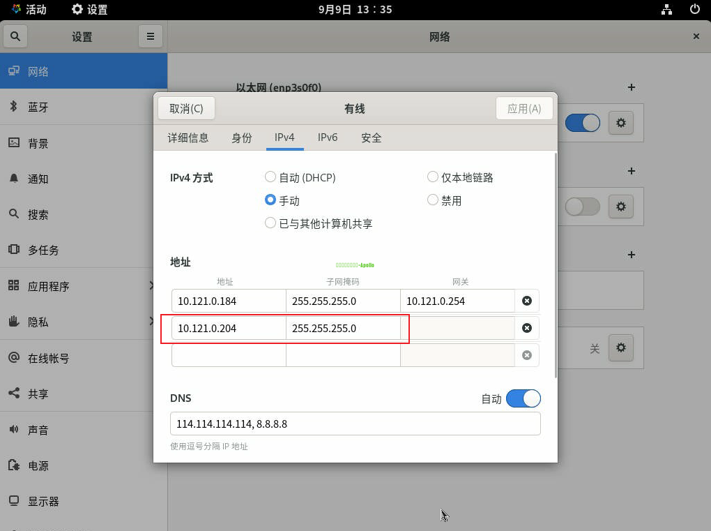 场景说明服务器有内外网需求,需要在一张网卡上配置两个IP分别对内外网提供业务 注意事项1、当前UC暂不支持web界面修改管理节点的IP信息,以下内容为UC安装前完成单网卡双IP配置的修改; 2、如果是UC已经安装完成后需要更改IP信息,可参考 修改IP地址 3、单网卡双IP,这两个IP需要配置成同一个网段的地址;该章节示例为安装UC前希望在原来的网卡基础上增加一个IP地址10.121.0.204 4、有图形化界面的,可以图形化界面上直接添加一个同网段的IP地址;注意,配置添加完IP地址之后,点击“应用”,然后重启下网卡开关。如果没有图形化界面,也可以命令行添加,详细操作详见后面的操作步骤