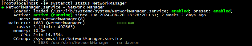 Loaded显示为enable,则表示已设置为开机启动 Active显示未active(running)则表示服务正在运行 如果状态是disabled,需要systemctl enable NetworkManager