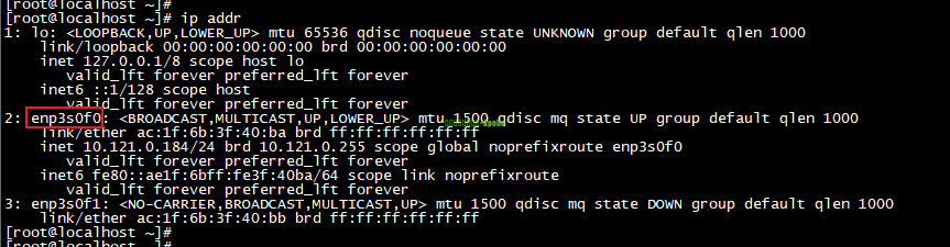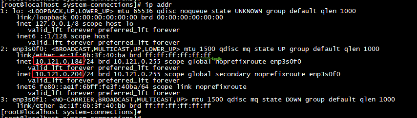 注:可以看到目前只有enp3s0f0这张网卡有一个IP是10.121.0.184;单网卡双IP场景需要在这张网卡上新添加一个同网段IP 10.121.0.204 (2)确认网卡配置文件名称
