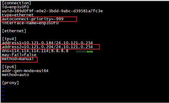 地址格式为:addressX=ip/子网掩码,网关 dns格式为:dns=dns地址1;dns地址2(多个DNS中间用;隔开) method 模式:manaual表示手动模式,auto表示自动模式;需要配置为manual autoconnect-priority=-999:网卡自动连接,有些设备(特别是第三方),如果出现启动时无法自动连接网络,还需要在[connertion]中添加 onboot=true,设置在启动时自动连接网络 如下图: