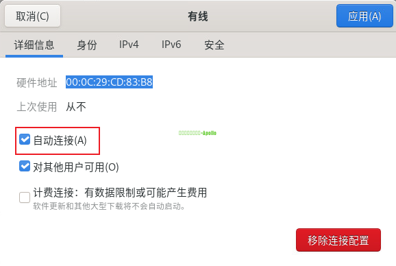 场景说明服务器有内外网需求,需要在2张网卡上配置2个IP分别对内外网提供业务 注意事项1、当前UC暂不支持web界面修改管理节点的IP信息,以下内容为UC安装前完成双网卡配置的修改; 2、如果是UC已经安装完成后需要更改IP信息,可参考 修改IP地址 3、两张网卡的IP地址必须要配置不同网段的;该章节示例为安装UC前,希望在已有的ens224网卡上增加一个IP地址10.121.4.29 4、有图形化界面的,可以图形化界面上直接添加一个同网段的IP地址;注意,配置添加完IP地址之后,点击“应用”,然后启用下网卡开关。如果没有图形化界面,也可以命令行添加,详细操作详见后面的操作步骤 网卡选择自动连接: