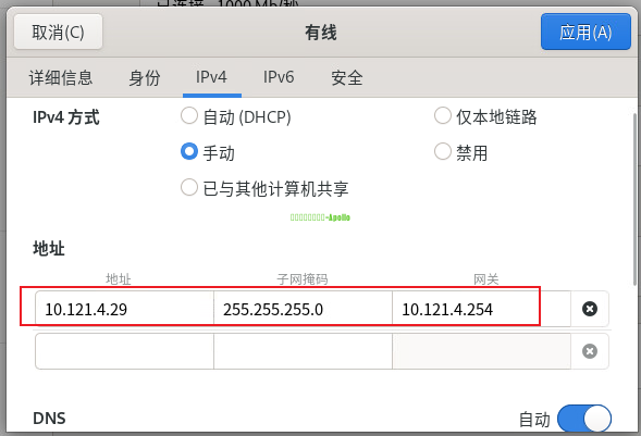 配置IPv4地址(方式为手动、地址配置与另外一张网卡不同网段)、DNS;最后点击应用,启动下网卡