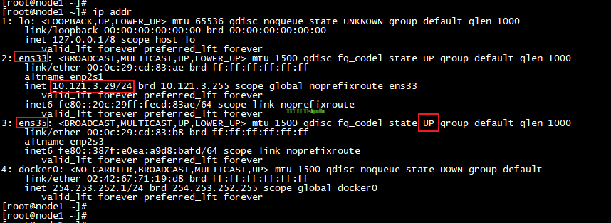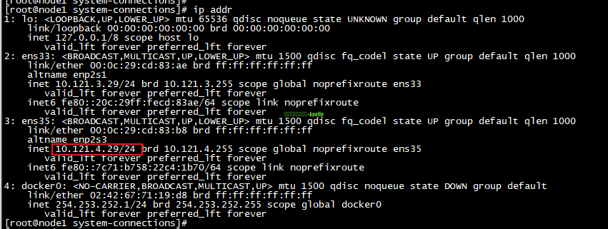 注:可以看到目前只有ens33这张网卡有一个IP是10.121.3.29;还有一张ens35的网卡目前状态UP,但是还未有IP。双网卡双IP场景需要在ens35这张网卡上新添加与ens33这张网卡不同网段的IP (2)确认网卡配置文件名称