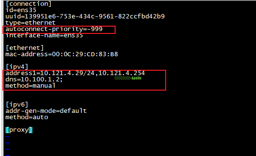 特别注意: autoconnect-priority=-999 代表自动连接优先级最高 地址格式为:addressX=ip/子网掩码,网关 dns格式为:dns=dns地址1;dns地址2(多个DNS中间用;隔开) method 模式:manaual表示手动模式,auto表示自动模式;需要配置为manual 有些设备(特别是第三方),如果出现启动时无法自动连接网络,可能还需要在[connertion]中添加 onboot=true,设置在启动时自动连接网络 如下图: