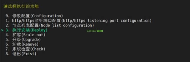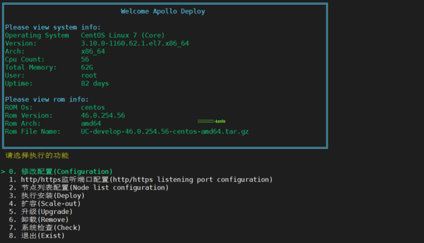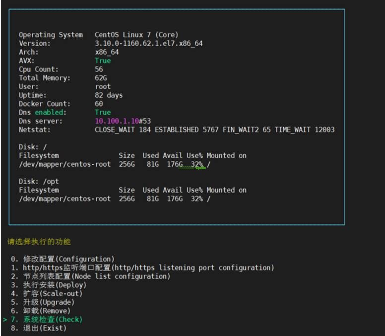 使用ssh工具登录Linux服务器(请参考 服务器SSH方式)1、上传系统包(其他上传方式请参考:rom上传服务器方法)将rom安装包上传到UC单机版本的服务器上,安装路径:/home cd /home //进入 home 目录下 rz //使用rz命令上传rom包,注意:如果系统没有安装lrzsz命令则无法使用rz命令;putty、cmd或其他一些软件使用rz可能会出现卡住的情况 在跳出的窗口中选择一下载好的rom包 2、解压rom包cd /home //进入安装包所在的目录 /home 下 tar -xzvf UC-release-46.0.0.2-centos-amd64.tar.gz //解压安装包,红色字体部分需替换成实际的安装包名称 3、选择安装企业租户模式并进入可视化部署目录(1)选择安装模式为单租户 cd /home/apollo_deploy ./scripts/install.sh 通过键盘按键“↑”或“↓”选中single,回车键进行选择 (注:单多租户选择后不能就返回修改,如果要修改可以进配置文件进行修改) (2)进入可视化部署目录页面,默认显示系统信息和rom包信息,安装前需核对系统信息及rom包信息是否符合要求 Please view system info:系统信息 Operating System CentOS Linux 7 (Core) //操作系统 Version: 3.10.0-1160.62.1.el7.x86_64 //版本信息 Arch: x86_64 //硬件结构类型 Cpu Count: 56 //CPU信息 Total Memory: 62G //内存大小 User: root //当前登录用户 Uptime: 82 days //启动时间 Please view rom info:rom包信息 ROM Os: centos //rom包支持的系统 Rom Version: 46.0.254.56 //rom包版本号 Rom Arch: amd64 //rom包支持的硬件结构类型 Rom File Name: UC-develop-46.0.254.56-centos-amd64.tar.gz //rom包文件名 4、安装前进行系统检测(1)键盘按键“↑”或“↓”选中7.系统检查(check),点击回车查看检测信息 (2)核心检查信息说明: AVX: 检测avx指令集是否存在,True表示存在,False表示不存在(注:X86需要依赖avx指令集,否则sfu相关服务会启动失败) Cpu Count: 显示当前服务器的CPU信息 Total Memory: 显示当前服务器的内存信息 Docker Count: 显示已部署的docker服务个数,如果是0,代表环境没有安装过UC系统;如果是1,代表之前安装过UC但已卸载;如果是大于1,则可能是环境没卸载干净或者已经安装UC未卸载 Dns enabled: Dns enable显示True:代表dns可用,Dns server显示具体dns信息。 Dns enable显示False:代表dns不可用,可以进入vi /etc/resolv.conf配置nameserver地址;若无可用的dns服务地址则不需要进入配置 Dns enable显示空:代表服务器未安装nslookup命令(用于监控网络中的DNS服务器是否能够正确实现域名解析),可以选择安装nslookup命令(yum -y install bind-utils)或者手动查看cat /etc/resolv.conf文件,检查dns配置是否正常 Netstat: 显示端口使用情况 Disk:检测/和/opt目录,主要查看use使用率;如果超过80%就需要进行清理或者扩容空间,以免超过80%后功能无法正常使用 5、执行安装脚本,确认安装结果(1)键盘按键“↑”或“↓”选择对应安装命令(单机单租户安装大概需要20分钟左右) 选择3. 执行安装(Deploy)回车选择1.直接安装 //正式部署环境使用,对系统进行预检,检测性能是否符合要求 选择3. 执行安装(Deploy)回车选择2.跳过预检安装 //测试环境下使用,可加跳过预检过程 注:使用“直接安装”安装脚本会对系统进行预检,检测系统性能是否符合要求。precheck检查项如下: ① CPU:是否有16核,暂不检查主频 ② 内存:是否有32G ③ 磁盘:先判断/opt是否有单独挂载: a. 如果没有单独挂载,且也没有在/opt下细化分区,则只会检查/目录大小是否有500G b. 如果没有单独挂载,但在/opt下有细化分区,则会检查/opt下所有细化的分区空间总和是否达到400G c. 如果有单独挂载,则只会检查/opt目录大小是否有400G (2)确认安装结果,failed=0则表示安装成功 注:若安装失败,则需要导出 /home/apollo_deploy/logs 中的日志文件出来排查失败原因 ① cd /home/apollo_deploy ② tar -czvf log.tar.gz logs //将所有安装日志进行打包 ③ sz log.tar.gz //CRT需用sz来下载文件;xshell、pshell等其他远程工具可使用FTP进行文件下载 下载后的文件在本地电脑的下载中可看到 |