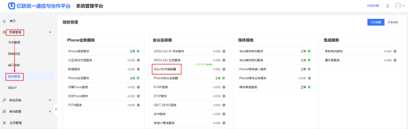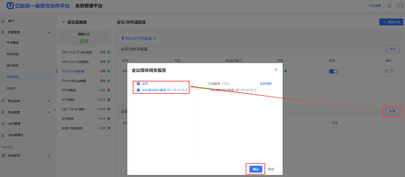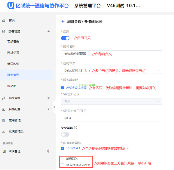 注意事项1、此章节主要用于讲解为了实现亿联二代终端点对点音视频通话及会议时需要在UC系统上配置什么服务;亿联二代终端可以认为是AVC终端; 2、此章节的配置需要先完成实现音频点对点通话 、实现音视频会议章节的配置;为了实现该场景的功能,还建议开启以下服务;服务包括:会议/协作适配器-Yealink AVC连接器、需要关联会议媒体网关服务 3、亿联二代终端包括:VC200、VC500、VC800、VC880 (1)终端配套版本说明,版本号示例为a.b.c.d 当b为345时表示终端是V45版本,支持UCV4X的https注册方式;终端注册方式可参考亿联二代终端注册方式 低于345时则需要当做普通SIP/H.323终端使用;终端注册方式可参考亿联终端SIP/H323注册 操作步骤1、进入系统管理平台 2、配置会议/协作适配器-Yealink AVC连接器 (1)找到部署管理-服务管理-会议连接器-会议/协作适配器,进入后点击右上角的添加 2)配置服务的参数,如果环境存在多个节点时,可以在应用节点处选择;勾选所有本地网络内的参数,其他参数默认即可,配置完点击下方的确定即可完成; (3)找到部署管理-服务管理-会议连接器-会议/协作适配器,进入后点击右侧的配置,勾选已经配置的会议媒体网关服务后点击确定即可完成; 这里就可以理解为会议媒体网关服务是给会议/协作适配器提供媒体服务的 |
