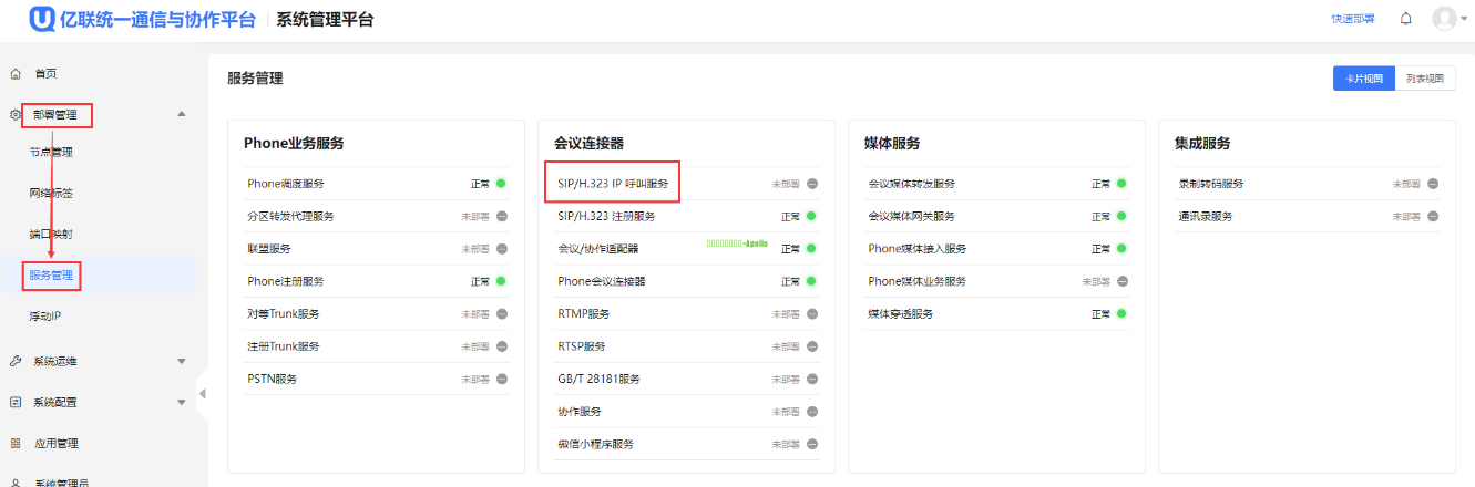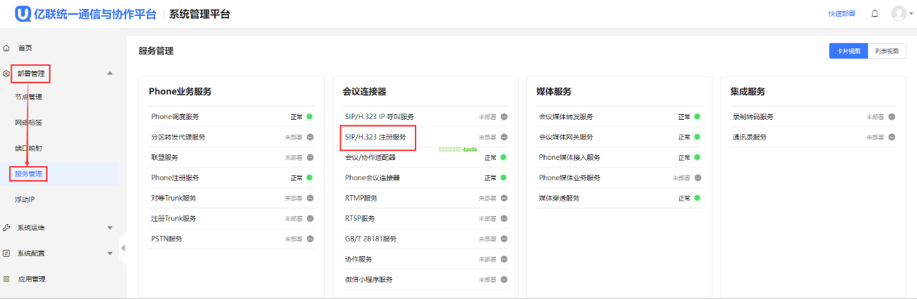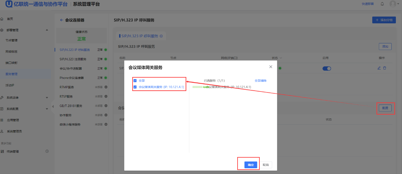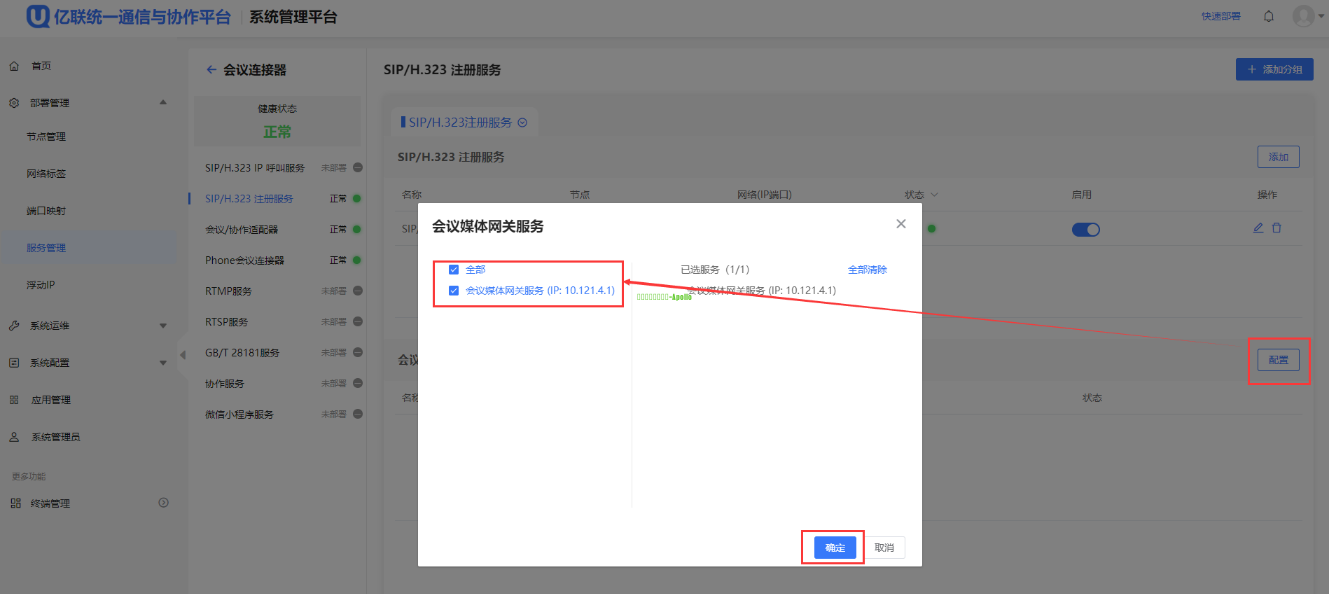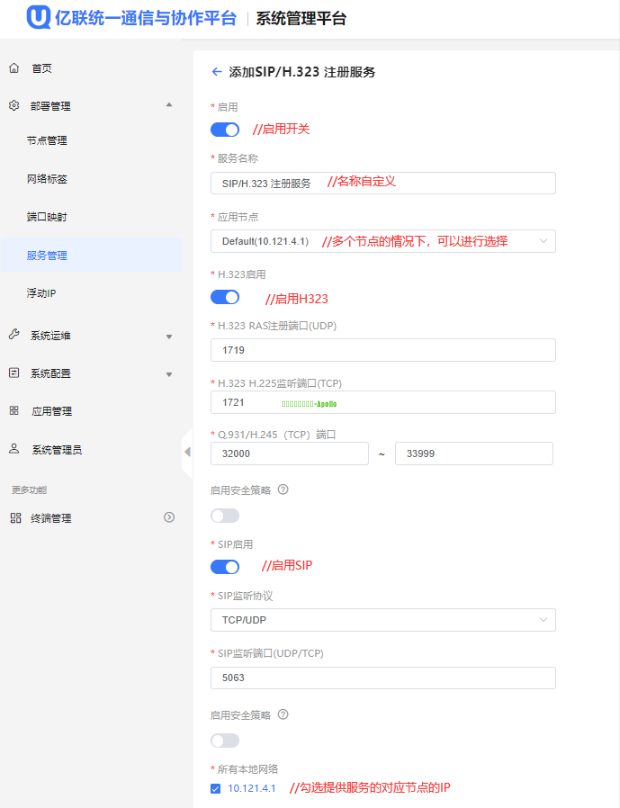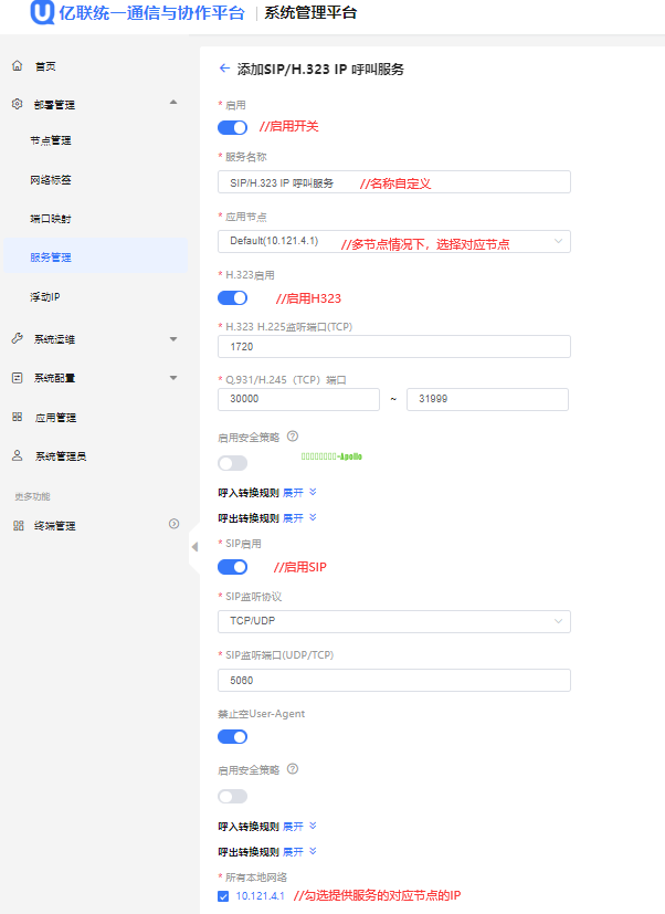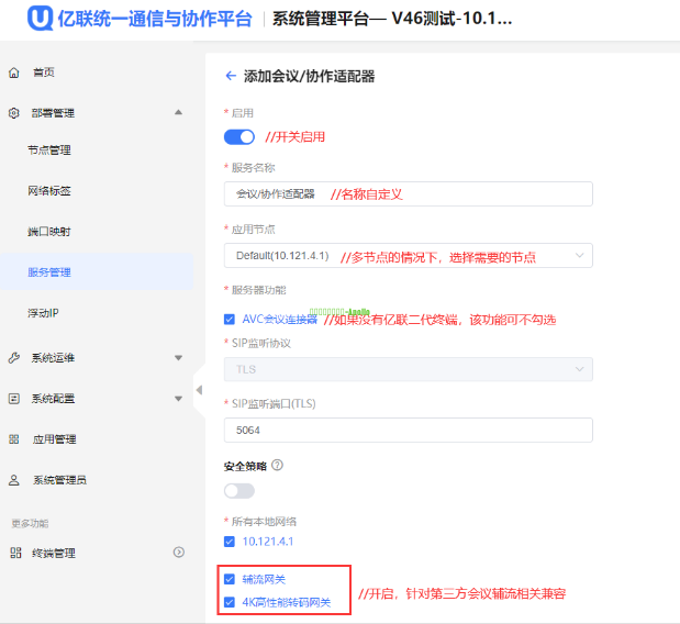 注意事项1、此章节主要用于讲解为了实现第三方厂商的视讯终端音视频会议需要在UC系统上配置什么服务; 2、此章节的配置需要先完成实现音频点对点通话 、实现音视频会议 章节的配置;为了实现该场景的功能,建议开启以下服务;服务包括:SIP/H.323注册服务、SIP/H.323 IP呼叫服务配置、会议/协作适配器中的辅流网关、会议/协作适配中的4K高性能转码网关; 3、SIP/H.323 IP呼叫服务也适用于与第三方厂商的MCU通过IP的方式IP直拨级联;有公网环境时建议SIP IP 呼叫服务即SIP IP直拨服务关闭,互联网中充斥着大量的SIP IP直拨攻击,会消耗掉服务器的一部分性能; 4、该章节内容适用的终端如下: 操作步骤1、进入系统管理平台 2、配置SIP/H.323注册服务 (1)找到部署管理-服务管理-会议连接器-SIP/H.323 注册服务,进入后点击右上角的添加 (2)配置服务的参数,如果环境存在多个节点时,可以在应用节点处选择;按照需要开启SIP或H.323服务开关;勾选所有本地网络内的参数,其他参数默认即可,配置完点击下方的确定即可完成; (3)找到部署管理-服务管理-会议连接器-SIP/H.323注册服务,进入后点击右侧的配置,勾选已经配置的会议媒体网关服务后点击确定即可完成; 3、配置SIP/H.323 IP呼叫服务 (1)找到部署管理-服务管理-会议连接器-SIP/H.323 IP呼叫服务,进入后点击右上角的添加 (2)配置服务的参数,如果环境存在多个节点时,可以在应用节点处选择;按照需要开启SIP或H.323服务开关;勾选所有本地网络内的参数,其他参数默认即可,配置完点击下方的确定即可完成; (3)找到部署管理-服务管理-会议连接器-SIP/H.323 IP 呼叫服务,进入后点击右侧的配置,勾选已经配置的会议媒体网关服务后点击确定即可完成; 3、配置会议/协作适配器中的辅流网关、会议/协作适配中的4K高性能转码网关 (1)找到部署管理-服务管理-会议/协作适配器-添加-辅流网关、4K高性能转码网关,进入后点击右上角的添加 2)找到部署管理-服务管理-会议/协作适配器-添加-辅流网关、4K高性能转码网关,进入后点击右侧的配置,勾选已经配置的会议媒体网关服务后点击确定即可完成; 这里就可以理解为会议媒体网关服务是给会议/协作适配器提供媒体服务的; 说明: 4K高性能转码网关的作用: |