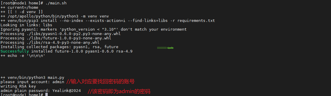 3、执行脚本./main.sh 输入要找回的账号(例如单租户的admin或9999)