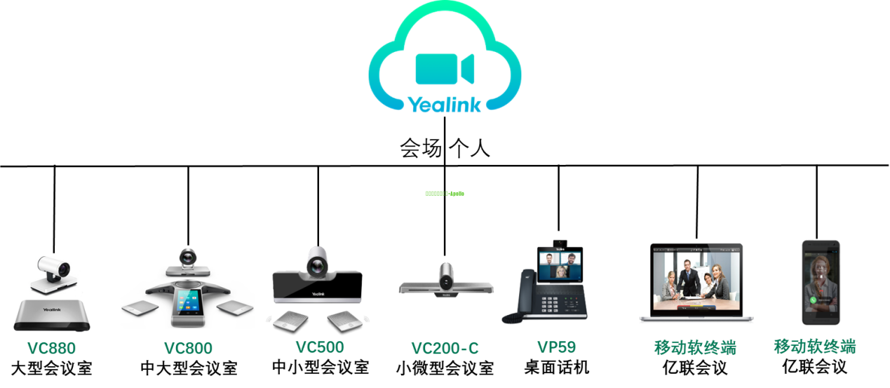 图 3 高清视频会议系统组网拓扑图 如图 3 高清视频会议系统组网拓扑图所示:企业根据需求在企业管理云平台上开通XX个点并发视频会议的服务,批量新增用户,设置用户权限等操作。用户按需购买,根据入会并发需求开通视频会议的云服务授权。 XX主会场部署亿联高清视频终端Vxx,XX分会场则部署一体式高清终端xx。企业内员工均可以登录员工账号发起会议邀请及会议控制。出差员工也可以通过手机、电脑软件客户端加入会议,享受随时随地参会的高清视频会议体验。另外,于领导办公桌可选配亿联旗舰视频会议话机VP59,领导于办公室内即可一键呼入指定会议,降低时间成本,提升入会体验。 最后,通过亿联VCH配件(WPP20无线辅流配件),可以实现各终端全高清辅流分享,简单连线后,便可实现高清分享本地辅流,使得各参会人员均可接受本地分享的电脑文件及视频。 亿联全系列产品支持业界标准的SIP、H.323协议,良好的兼容性、灵活的对接方式确保此系统未来与上级视频会议系统的无缝对接,切实保护用户投资。 视频会议系统建设应有前瞻性,不能局限于满足现状,系统需要具备升级与扩展能力。本项目建设一个高度集成、面来未来的新型信息化平台,在核心平台的支撑下,各个子系统都可以互联互通、协同工作,实现系统全方位灵活组合的功能应用。 2.1 网络带宽 此次XX远程高清视频会议系统实现1080P@30fps全高清视频效果,为了达到完美的高清效果,建议每路通话规划此次网络预留1.5Mbps以上的带宽。 Yealink视频会议系统带宽需求: 视频分辨率 | 推荐带宽需求 | 全高清 1080P(1920x1080) | 1.5Mb | 全高清+辅流:(人像+内容) | 3Mb | 高清 720P(1280x720) | 700Kb | 高清+辅流:(人像+内容) | 1.5Mb | 标清 448P(768x448) | 500Kb | 标清+辅流:(人像+内容) | 1Mb |
