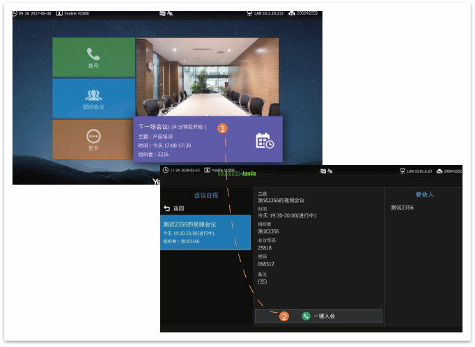 从以上数据可以看出,高清视频会议是对实时性要求较高的网络应用。这就要求作为其基础的承载网络有较高的带宽和对网络中的业务流量有较高的控制能力。为了满足流畅的高清视音频效果,就要求带宽至少在1.5Mbps以上。 三、系统功能视频会议系统建设旨在通过远程视频技术实现快速沟通、快速领导决策,能够提高办公效率,该系统可为传达领导管理,布置工作计划,开展年度季度会议等重大及日常工作任务提供高效、便捷的会议组织方式,能够大大提高工作效率,减少会议开支,获得良好的社会及经济效益。 3.1 预约会议用户可以通过WEB/ 亿联会议客户端等多种会议预约方式。 在预约会议时可以预设定参会人员,参会时间,参会主题等信息,并且可以通过邮件形式发送给预设定参会人员邮箱进行会议预约。 3.2多种入会方式 一键入会 系统支持推送会议日程信息至所有终端,所有的终端都能够显示会议的信息。终端用一键入会的功能,方便用户在到达相应的时间点击按钮一键加入会议,更便捷、高效的进行视频会议。