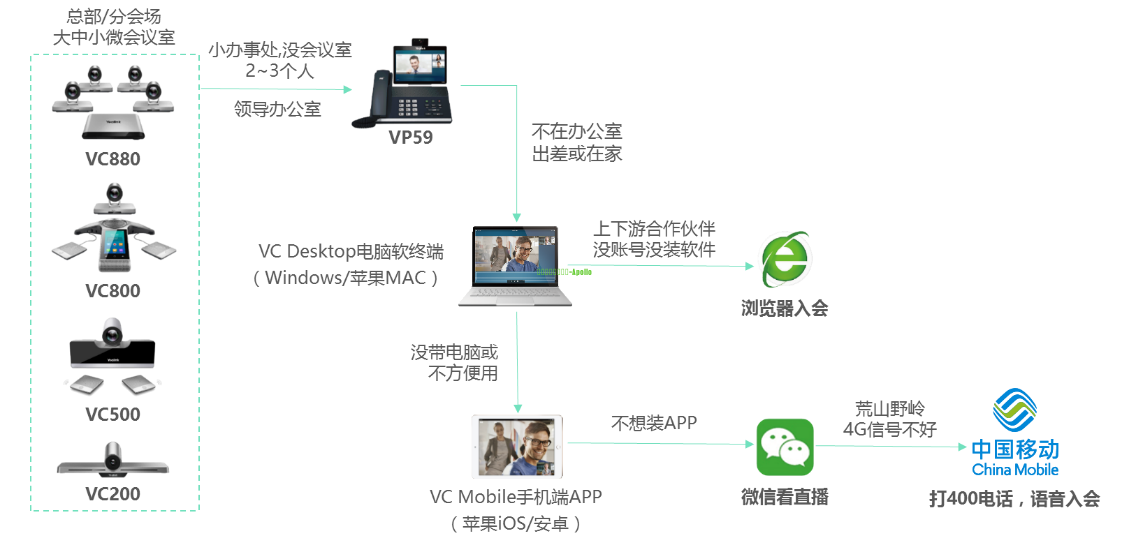 4.4.2 全场景终端入会除了传统的会议室终端通过固定线路接入平台之外,新系统具备最广泛的终端接入方式,实现全场景的视频应用覆盖: 个人移动智能设备:系统支持安装在智能手机、Pad、PC等移动设备上的APP客户端,覆盖windows、安卓、IOS等系统。 全网接入:通过互联网、移动3G/4G,实现随时随地音视频应用的接入。 电话接入:支持手机或固话语音入会,适用于无网环境下便捷参会。 随着技术发展的日新月异,新兴的业务需求层出不穷。新系统的设计除了对现有系统的兼容性考虑,更多是面向未来的开放扩展、生态互联的需求。 4.4.3 开放API、SDK云 API:开放会议预约、会议控制、账号管理、会议管理等模块接口。 软终端 SDK:开放账号注册、会议日程同步、联系人同步、即时会议/加入会议等通话相关接口。 多媒体接口:将其他系统的多媒体流,如监控视频、文档等,导入到视频应用,实现各类系统数据的开放互通 新系统除了自身的持续迭代更新外,保持面向未来的开放融合能力,与时俱进的同时不做信息孤岛,与用户的其他系统、业务流程无缝融合,让视频会议普及到每一个人、每一个业务系统和每一个流程节点。 |