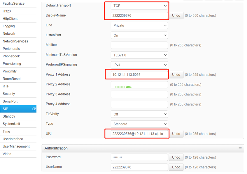 (2)配置SIP账号 Setup-configuration-SIP 参数说明: DefaultTransport(传输协议):根据需求选择TCP或UDP DisplayName(显示名称):填写账号 Proxy1 Address(代理地址):填写服务器IP:端口,默认端口5063(如果不确定可以先到UC4X的SIP/H323服务看下SIP端口) URI:填写账号@服务器主域名,如下图举例账号为2222239876,服务器主域名为10.121.1.113.xip.io UserName(账号):填写注册账号 Password(密码):填写对应注册账号的密码
