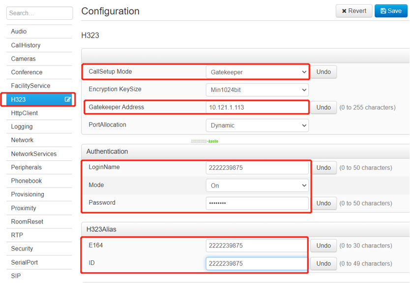 (2)配置H.323账号 Setup-configuration-H323 参数说明: callsetupmode:选择Gatekeeper Gatekeeper address:填写服务器ip LginName:填写账号 Password:填写对应账号的密码 E164及ID:填写账号