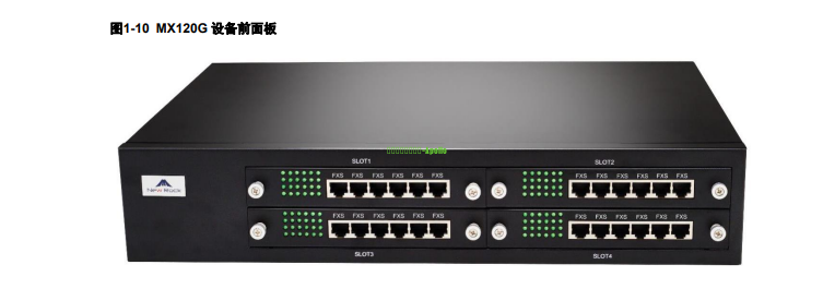 MX120G 设备可容纳 4 块灵活配置 FXS、FXO 数量的接口板卡,每块接口板卡配置 24 个端口。