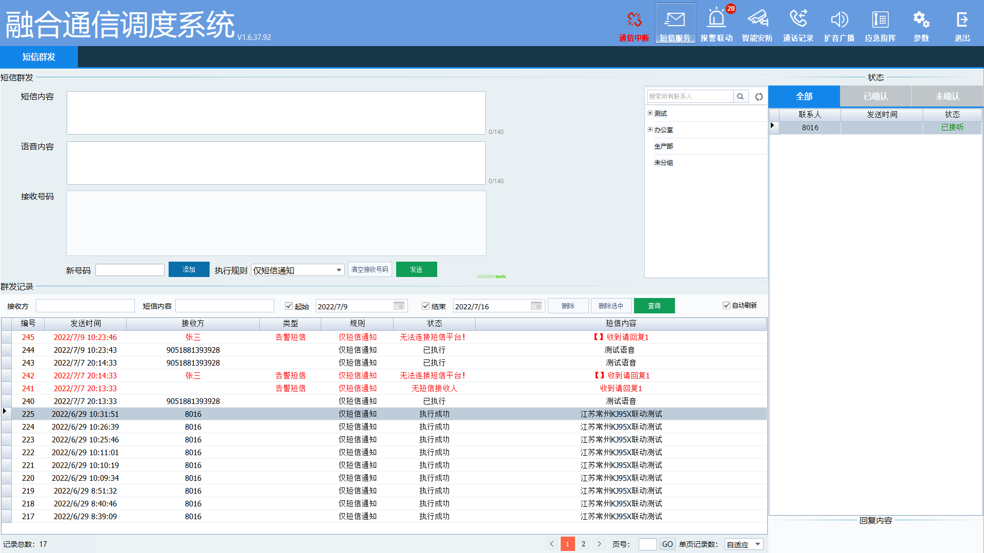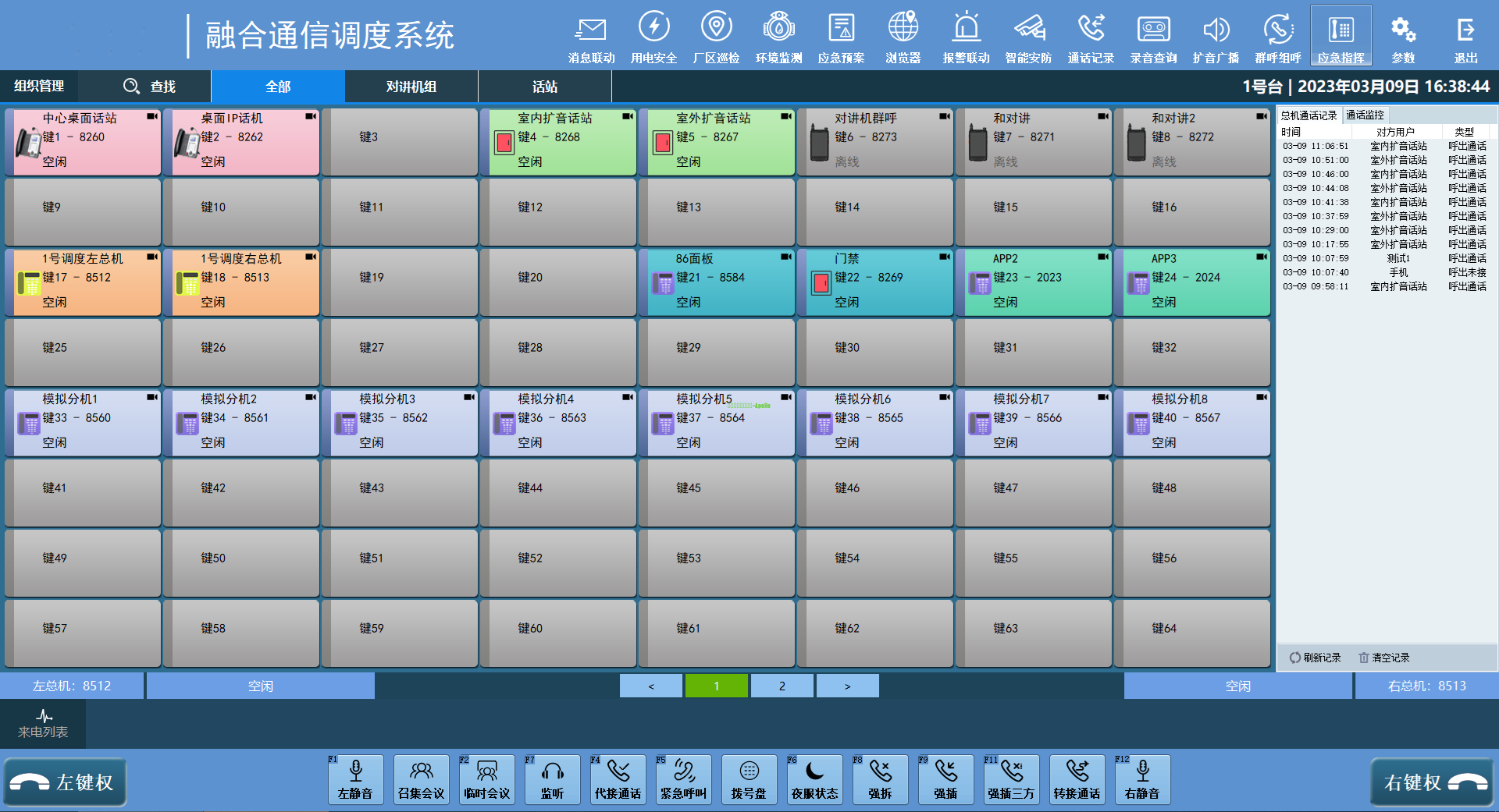 ü 搭建融合通信系统,将有线、无线、广播及独立分散的安防子系统等融入到融合通讯体系中,通过调度中心融合通信系统实现各联动模块之间的资源共享、协作联动和统一。 ü 丰富的通信手段,支持E1、FXO、SIP等多种接口,与运营商PSTN、行政电话系统、调度电话系统、广播系统、无线集群系统等进行对接连通。 ü 健全调度联络体系,通过收录各调度救援综合性消防救援队伍、专业调度救援队伍、调度志愿者队伍和调度管理专家队伍等人员的联络方式、技术背景等相应信息,通过调度中心一键拨打召集联络。 ü 融合对接监控系统,通过操控平台实现快速查看全场设备设施、运行状态、数据检测、报警状态、安防监控为调度中心的指挥调度提供多维数据的支撑保障。 ü 创建快速报警通道,各区域可通过防爆电话、手持对讲、扩音广播报警呼叫调度中心或通过消防、手报、气体报警等无源干节点一键报警至调度中心。调度中心的操控平台发出声、光、报警信息弹窗提醒,调度人员一键实现接警和调度联络。 ü 实现调度数据联动,推送至调度中心的报警信息自动唤醒报警位置(已做定位的)、报警类型、报警时间、视频监控、联络终端等多维信息数据,提升调度人员在应急事件下的响应效率。 ü 备份应急联络数据,将防爆电话、手持对讲、扩音广播不同终端实现集中录音,并将报警时间、报警类型、接警时间、接警人员、电话记录、视频记录。所有操作日志、支持回溯查询。 ü 上端平台或系统推送的超标告警信息反馈至融合通信系统,根据提前预设的处理流程,如短信群发、语音播报、区域广播、音视频会议等手段,指挥相应的应急队伍进行处理。 1. 5 融合通信调度系统应用场景介绍 1. 5.1 日常指挥调度应用场景 日常指挥调度,主要包含基础的语音调度模块,满足日常操作需求。在后端平台,需与厂区其他系统(如视频监控、无线对讲组、4G/5G终端、行政电话、调度电话、视频会议、广播系统等)对接。日常操作功能如下: |