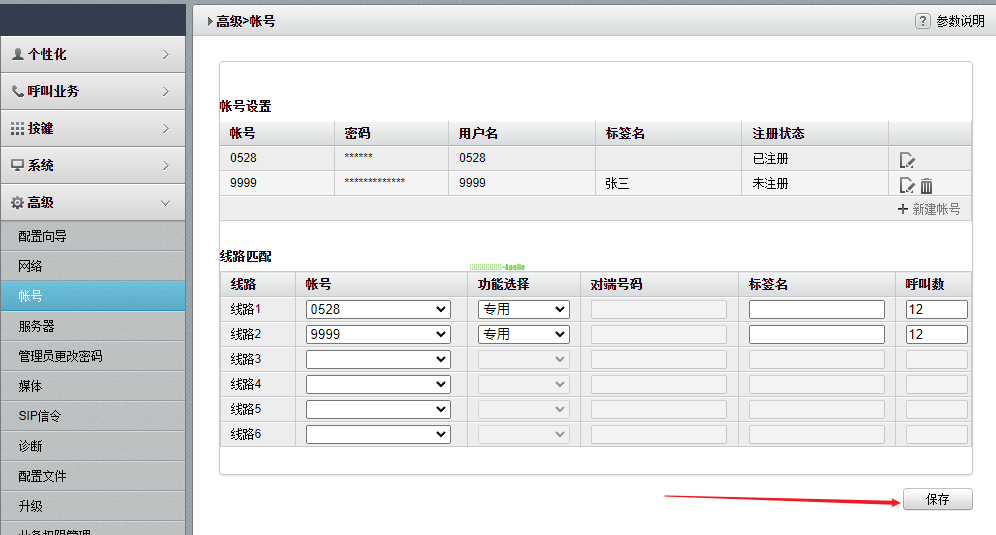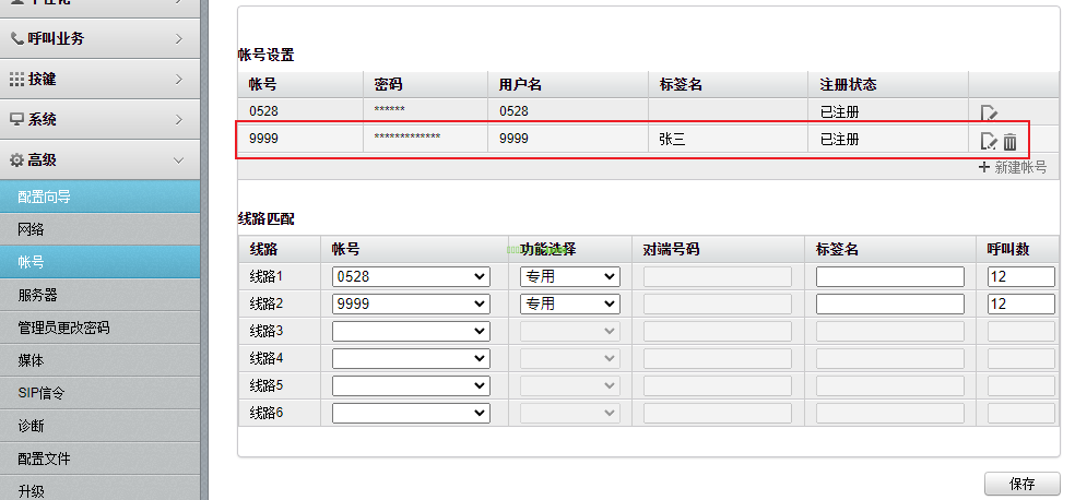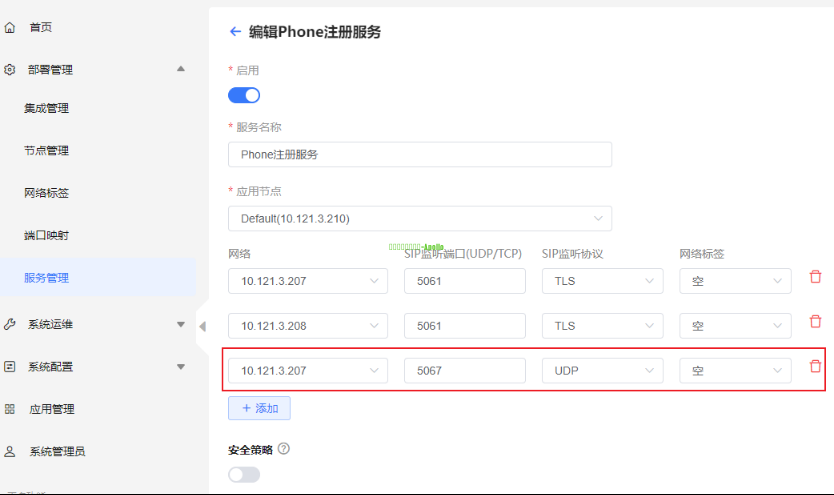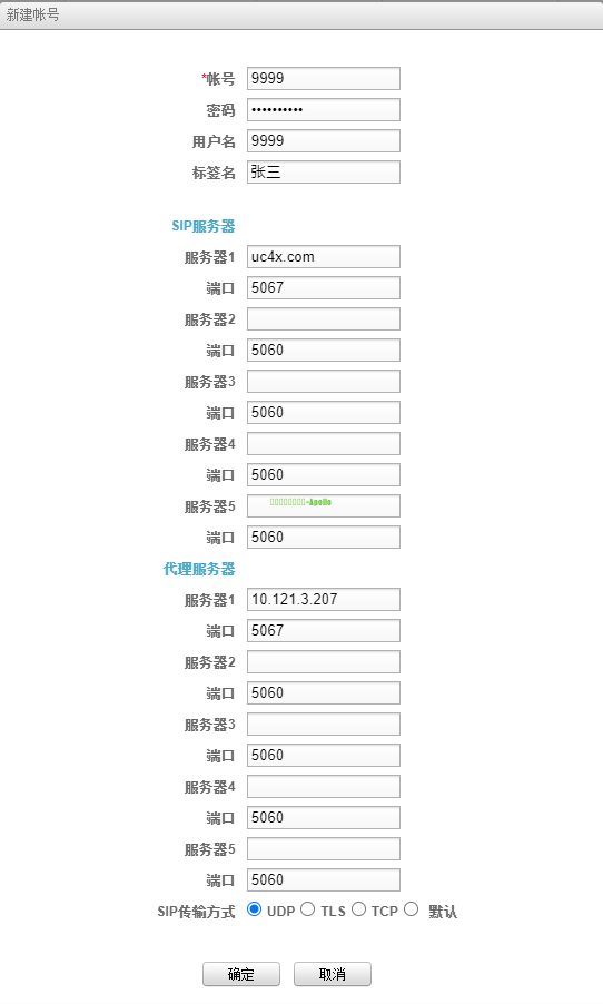 场景说明UC系统作为新项目切入系统,利旧客户原有华为VCS设备,能够实现基础音视频通话功能 关联设备注意事项1、实际项目中如果无法按照本章节完成注册,可确认是否是相同版本,建议尝试升至章节中版本再做对接; 2、此章节的配置需要先完成实现音频点对点通话的配置;账号密码创建请参考创建用户账号 ,这里不再重复说明;第三方终端注册需要占用终端注册许可; 3、本文举例内容为UC单租户,华为话机注册方式;如果是UC是多租户,需要注意华为话机在注册时分机号仍然填写短号,但是SIP服务器需要写企业号.主域名格式 \ 配置步骤1、进入UC系统管理平台,开启服务管理-Phone注册服务,为第三方话机新建一条协议为TCP或UDP的配置(Phone注册服务要关联Phone媒体接入服务) 2、浏览器登录eSpace 7920的管理界面 (1)点击高级-账号,在账号设置区域,点击新建账号 (2)设置以下账号参数 账号:填写分机号,(如果是要注册到UC多租户的账号,如1234) 密码:填写对应分机密码 用户名:填写分机号,(不论UC是单租户还是多租户此处账号都填写短号形式) 标签名:自定义标识该账号的名称,例如张三 SIP服务器 服务器1:填写UC服务器域名(单租户此处只需要填写域名即可,如果注册的是UC多租户的账号,那么此处格式为 企业号.主域名) (可到UC系统管理平台-系统设置-基础设置-主域名/中心域名处查看) 端口:填写UC上第三方注册服务使用的端口,这里配置成5067 代理服务器 服务器1:填写UC代理服务器IP,这里配置成10.121.3.207 话机和服务器处于同一内网,则填写UC用于提供内网业务的节点IP地址 话机处于服务器的外网,则填写UC映射后的公网IP地址 端口:填写UC上第三方注册服务使用的端口,这里配置成5067 SIP传输方式:选择UDP 其余参数保持默认 (3)页面右下角点击保存 验证效果1、华为eSpace 7920注册状态 |
