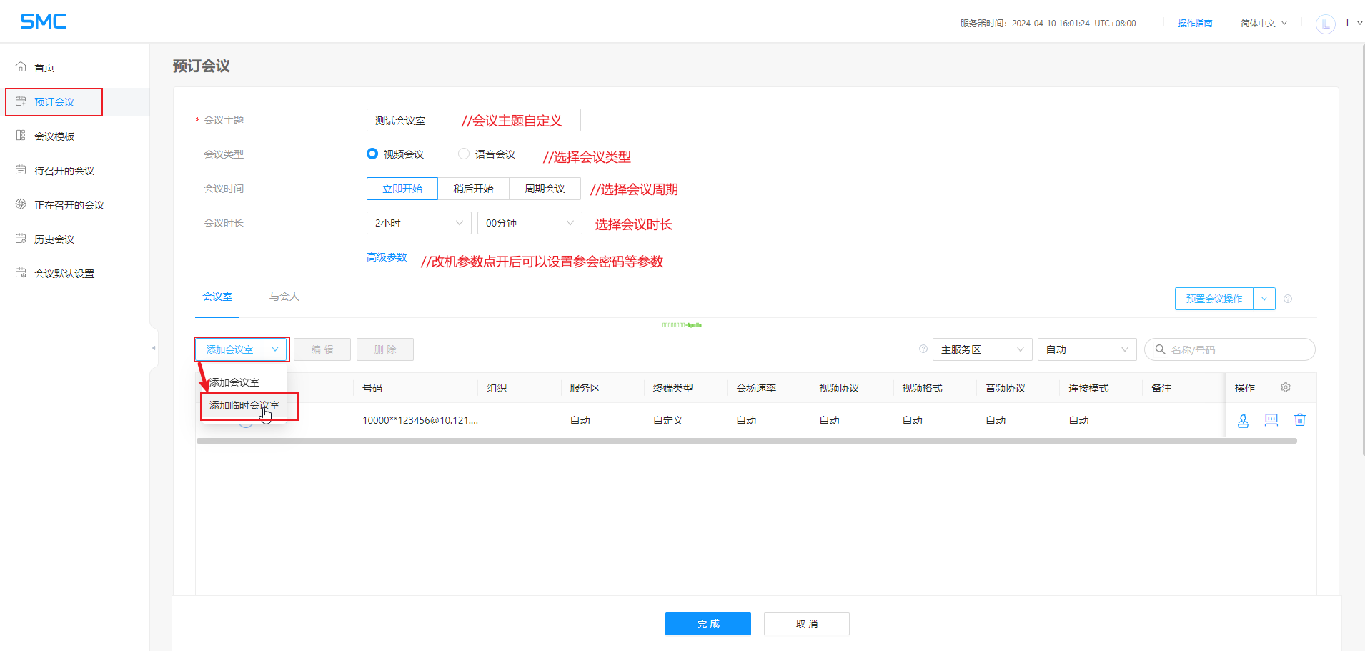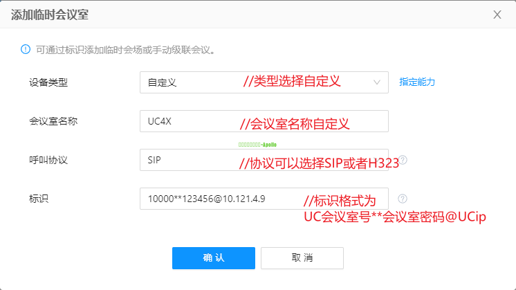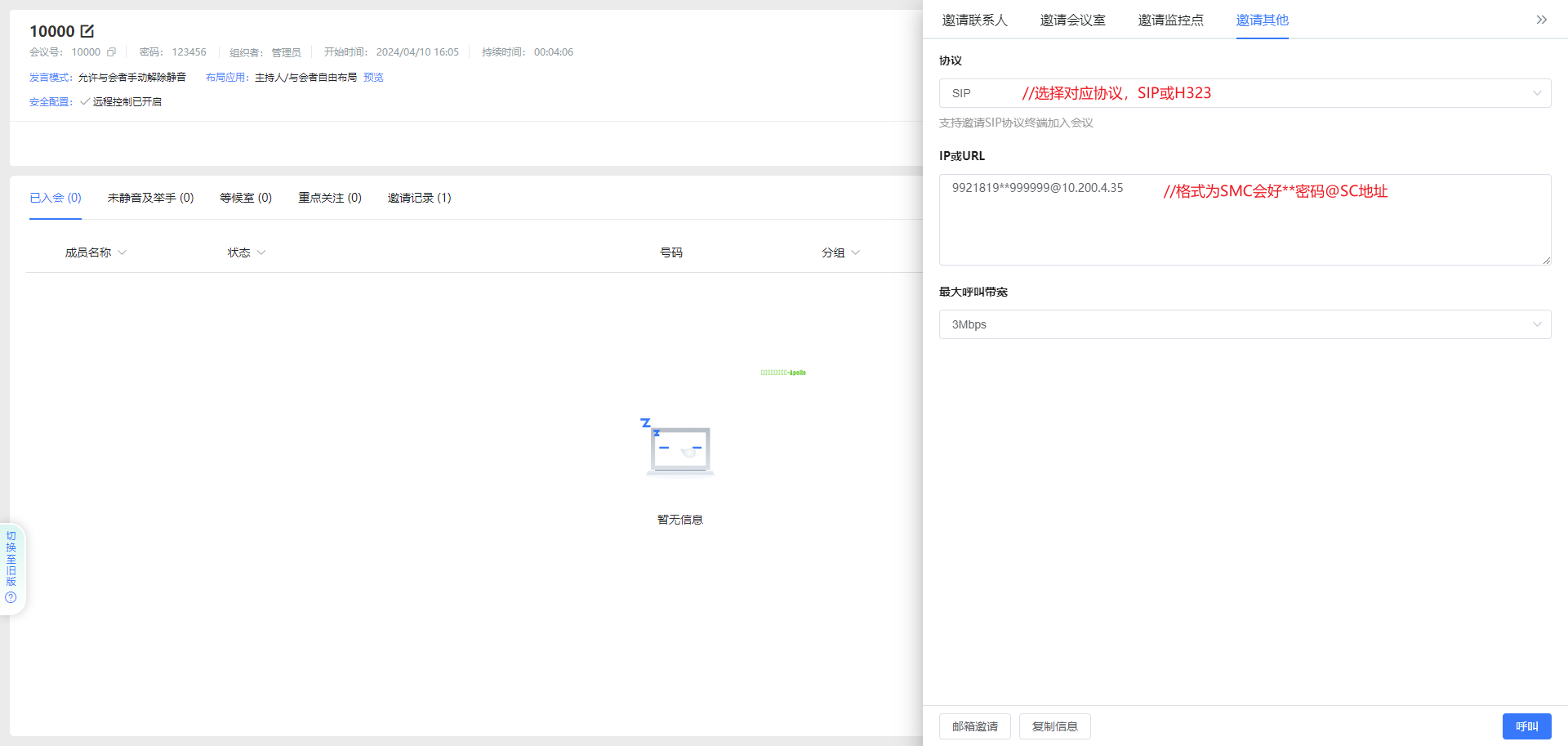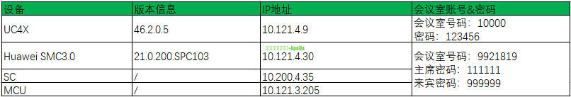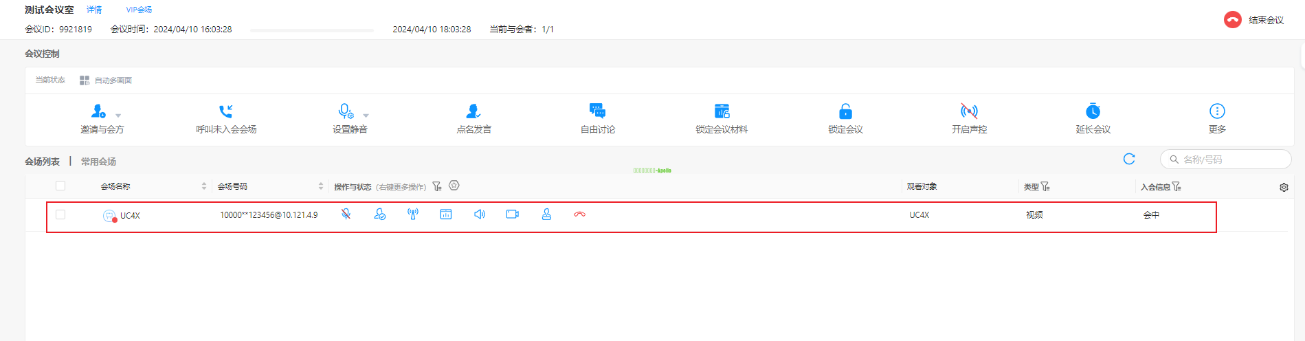 | 1、此章节的配置需要先完成UC上的服务配置:SIP/H.323 IP呼叫服务、会议/协作适配器、媒体转发服务、媒体网关服务、媒体穿透服务; 2、会议室添加请参考添加云会议室 这里不再重复说明; 3、UC与SMC3.0环境信息如下: 操作步骤SMC邀请UC入会1、在UC4X上创建云会议室企业管理平台-空间管理-云会议室-添加会议室 2、在SMC3.0上创建会议可以从预定会议中直接创建临时会议室;也可以从会议模板-新建模板中创建固定会议室 点击完成,然后点击进入会控 3、确认UC会议进入SMC会议中UC侧也可以看到SMC UC邀请SMC入会1、进入UC会控界面,点击邀请成员2、输入SMC会议进行呼叫 |